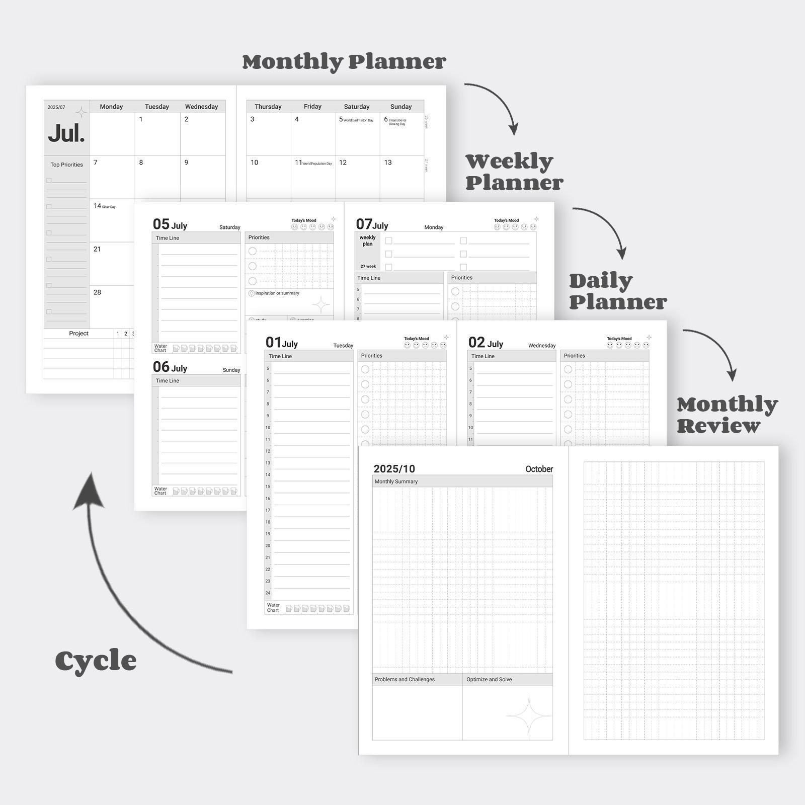 【Weekly & Monthly Layouts】: Includes structured weekly and monthly layouts for comprehensive planning, ensuring you never miss important tasks or events.